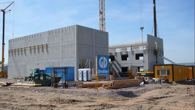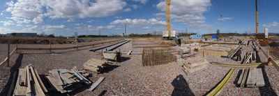 As time progresses we can see more and more of the building growing - the first floor will be completed this week. On the picture the central lift for the test tower (32m for solar silicon processing) can be seen.
