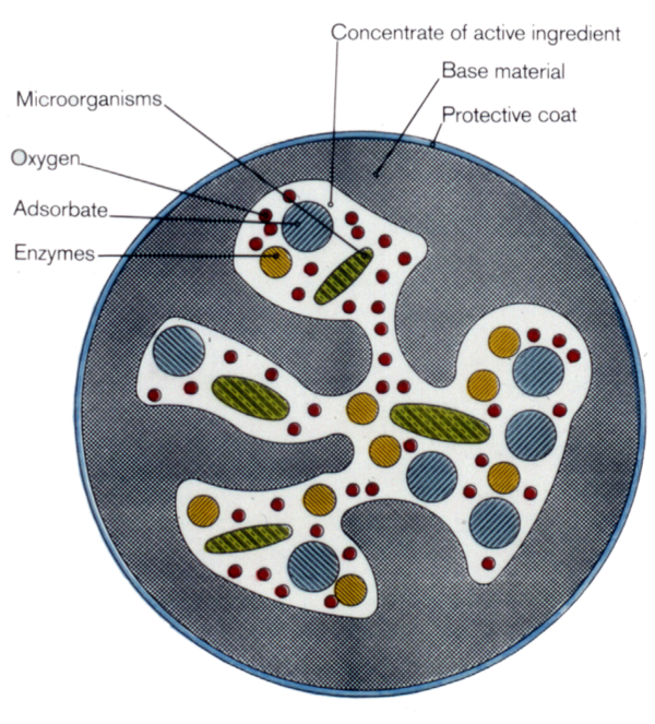 Schematische Mikrogranulate (von l. nach r.): Mikrokapsel mit fester Hülle und homogenem Kern, Mikrokapsel mit fester Hülle und Zellsuspension als Kern, Mikrokugel aus einer homogenen Mischung von Wirkstoff und Hüllmaterial